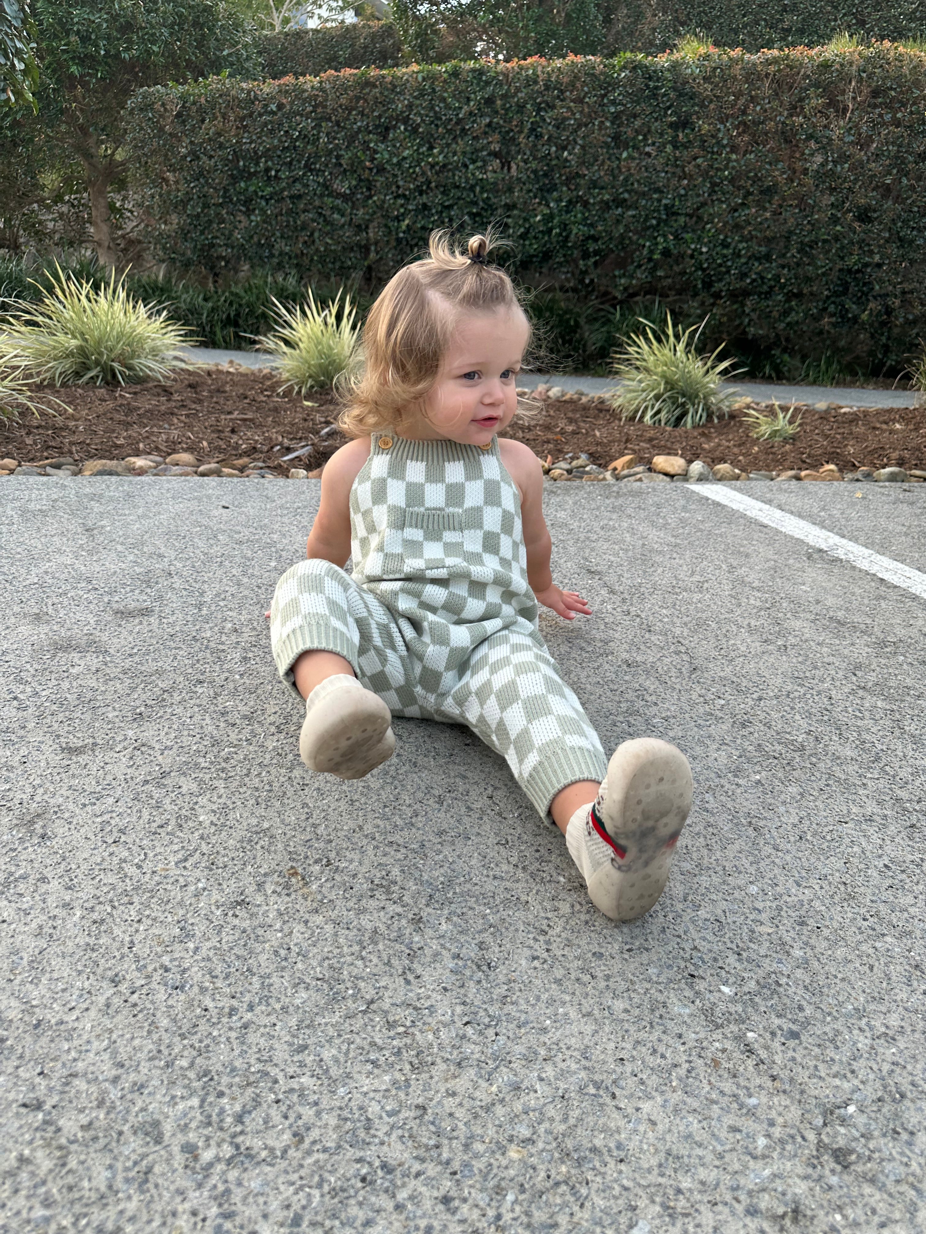 Checkered Knit Overalls Green